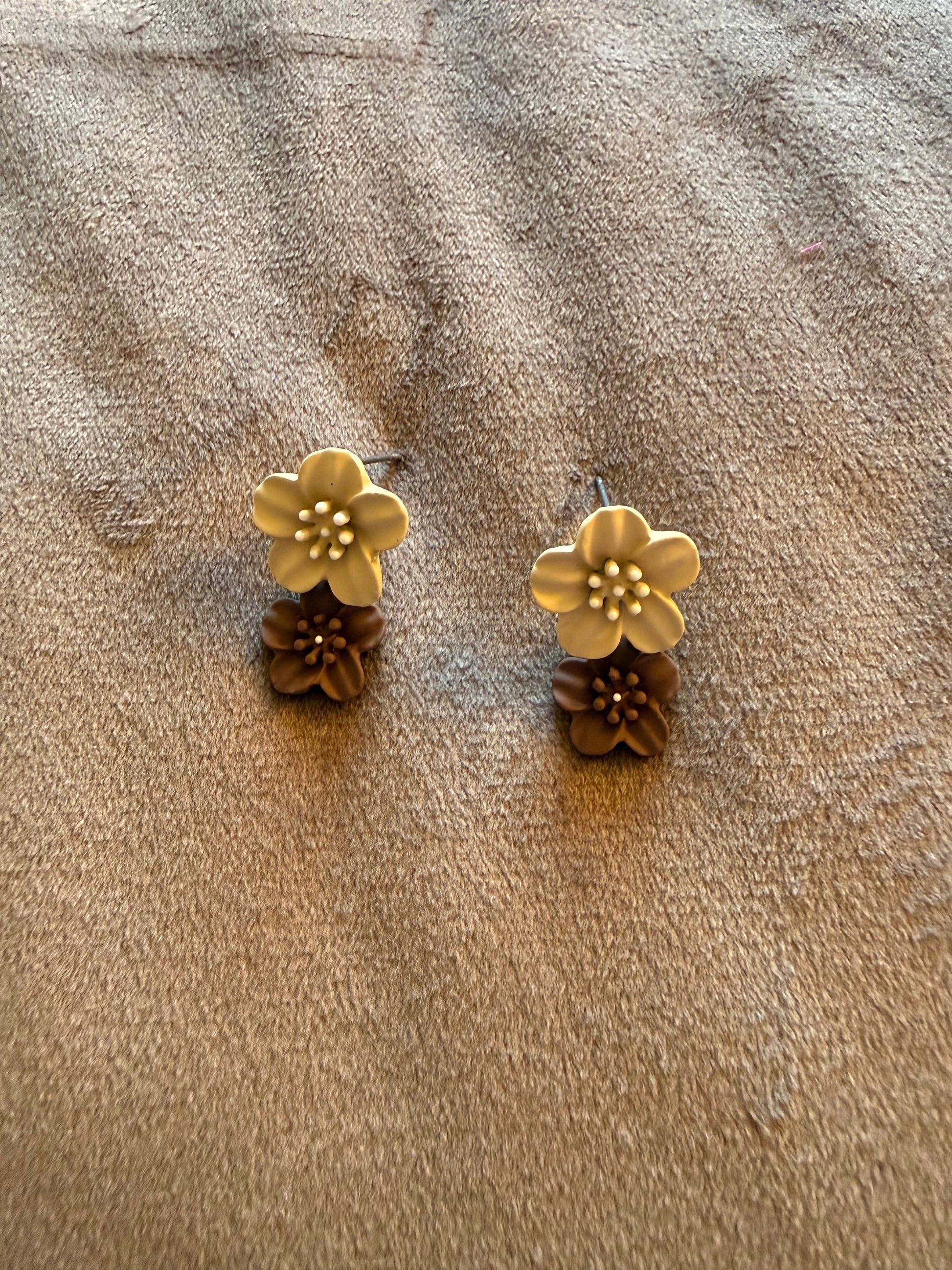 Deze goudkleurige oorbellen met dubbele bloemen in beige en bruin geven een warme en natuurlijke uitstraling. Perfect voor een rustige, stijlvolle look en makkelijk te combineren met neutrale tinten.