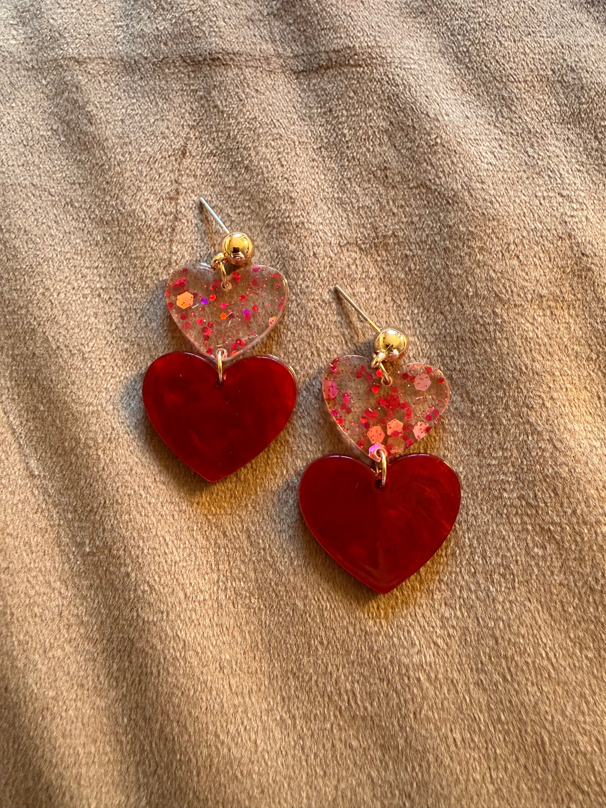 Deze opvallende oorbellen met dubbele hartjes combineren een transparant glitterhart met een diep rood hartje. De combinatie van glans en kleur zorgt voor een krachtige en vrouwelijke uitstraling.