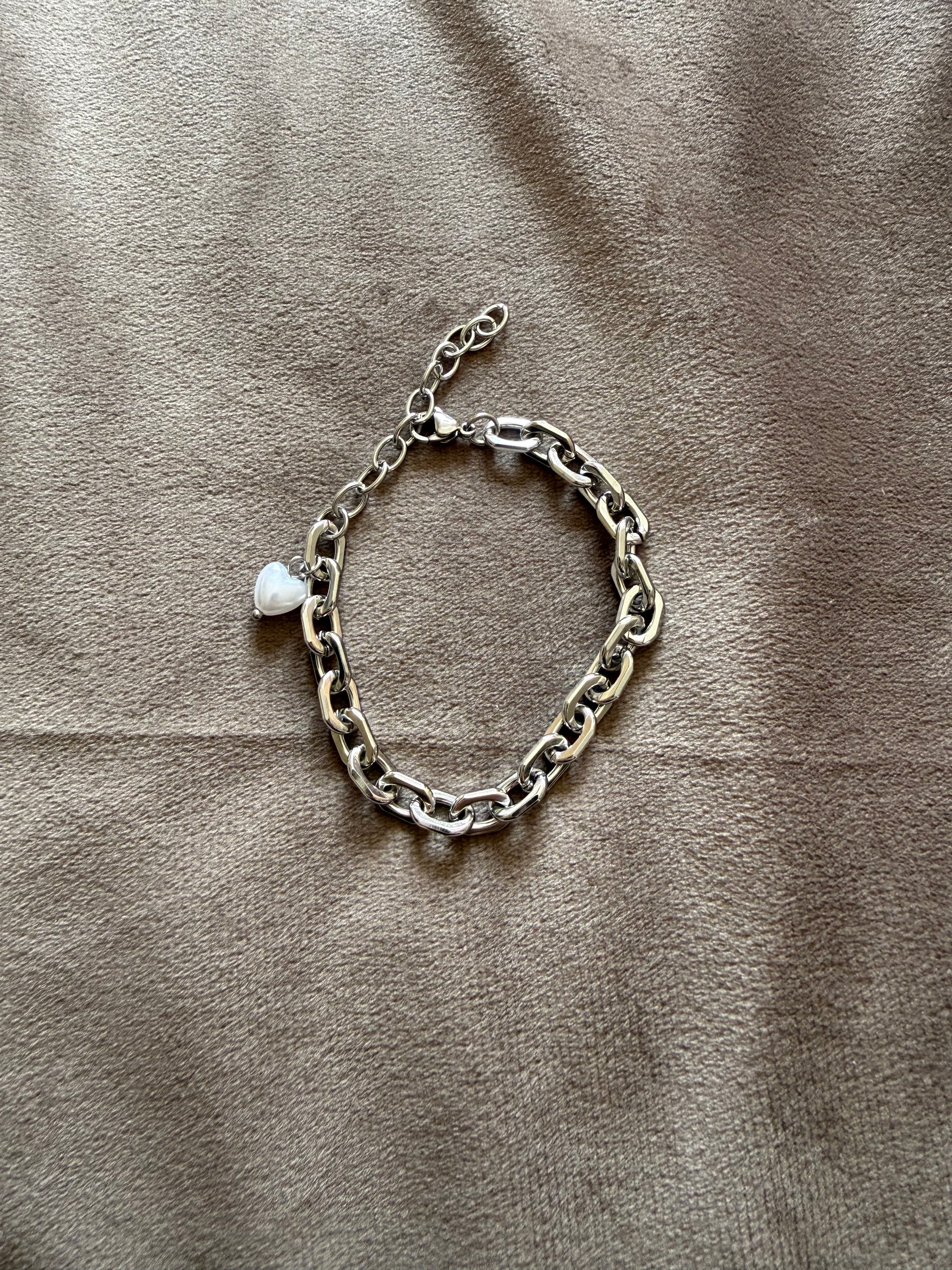Stijlvolle zilverkleurige schakelarmband met subtiel parel hartje 🤍✨